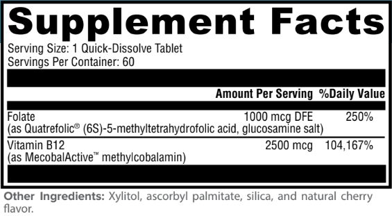 Metabolism B12 & Folate supports the metabolism of carbohydrates, proteins, and fat. It features Quatrefolic® and MecobalActiveTM in great-tasting vegan, cherry-flavored, quick-dissolve tablets. Quatrefolic is the glucosamine salt of 5-MTHF—the most biologically active form of folate that increases plasma folate more effectively than folic acid. MecobalActive is a patented, highly pure form of methylcobalamin—it’s body-ready B12.