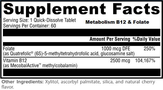 Metabolism B12 & Folate - Take 1 cherry-flavored tablet dissolved by mouth twice daily between meals,or use as directed by your healthcare practitioner.